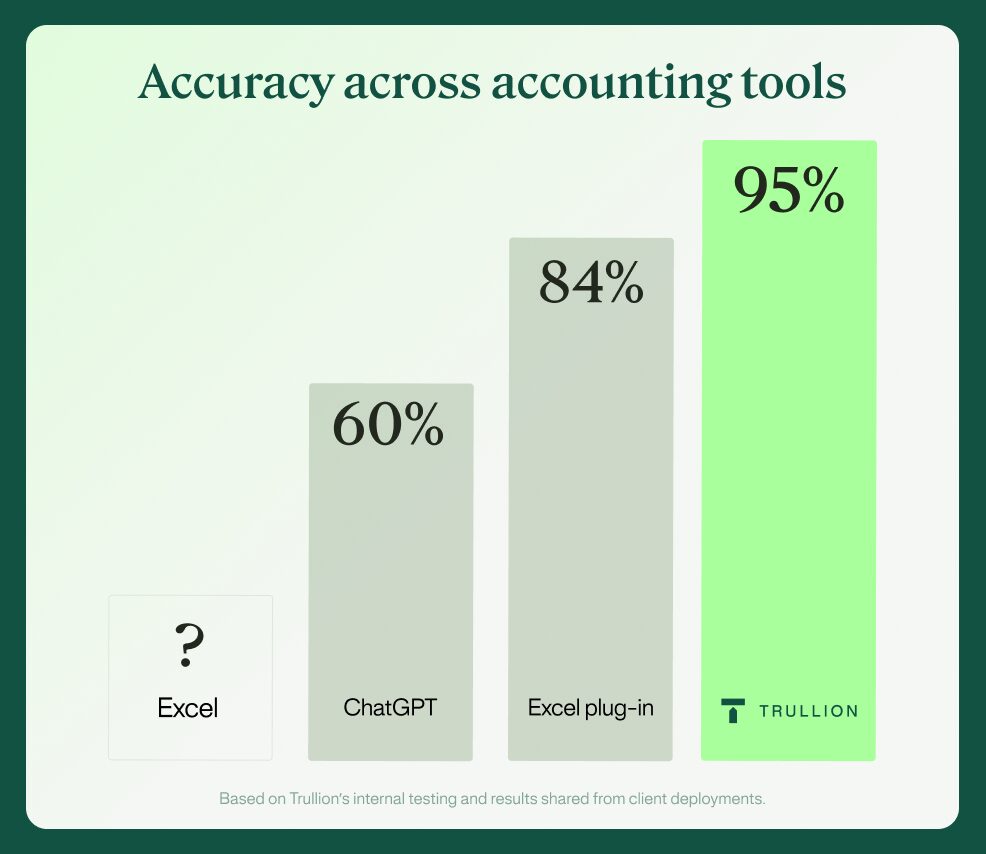 Building on those principles, Trullion achieves 95%+ accuracy and outperforms both generic LLMs and Excel plug-ins. When firms standardize their approach and pair AI with human oversight, they don’t just improve accuracy. They also accelerate throughput, reduce errors, and build defensible trust in their work.