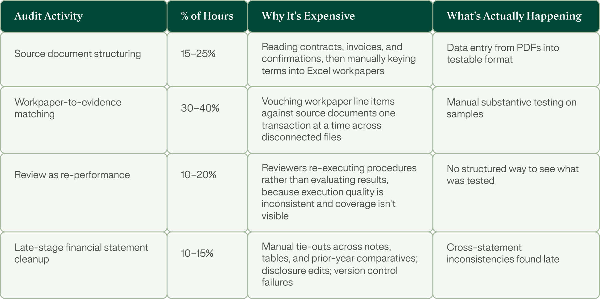 Together, these activities consume 65–90% of audit hours, yet they contribute minimal incremental professional judgment.